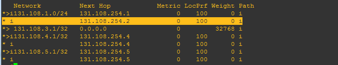 The preferred path on R3 to 131.108.1.0/24 is through R1; the peer address is 131.108.254.1 (R1's loopback address). When the TCP peer to R1 fails on R3, the preferred path is through R2 (a route reflector).