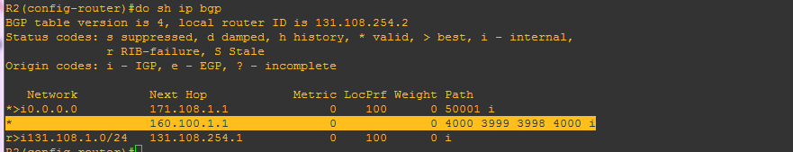 با اضافه کردن as-path های 4000 و 3999 و 3998 ،به مسیر 160.100.1.1 خروجی R2 را مشاهده کنید...