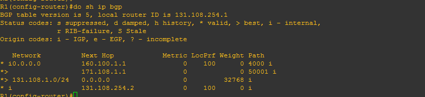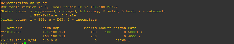در شکل مشاهده میشود که مسیر 171.108.1.1 که دارای MED کمتری نسبت به مسیر 160.100.1.1 است (برای 0.0.0.0) بعنوان مسیر بهتر معرفی شده...