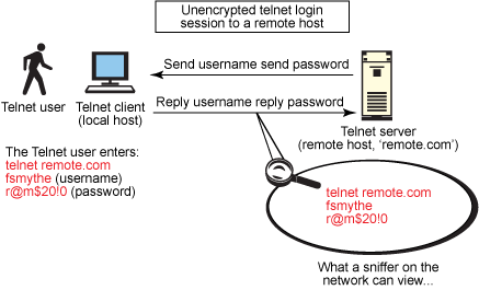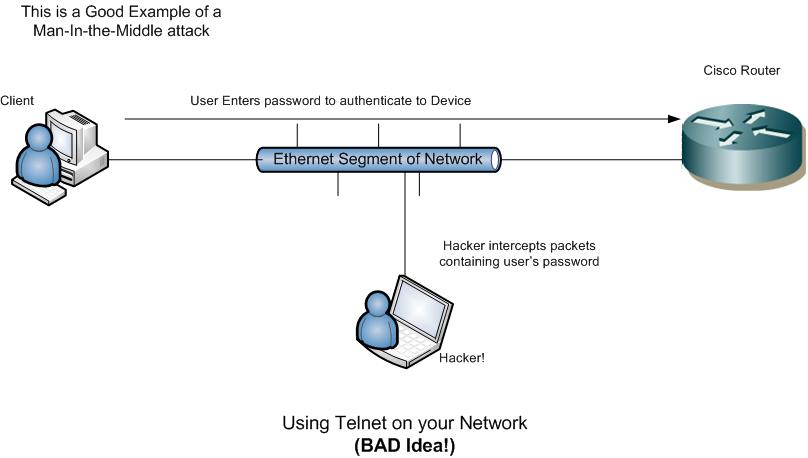 همانطور که در شکل زیر می بینید یک هکر با استفاده از حمله مردی ئر میانه می تواند با استفاده از ضعف پروتکل Telnet ، شبکه را sniff کند